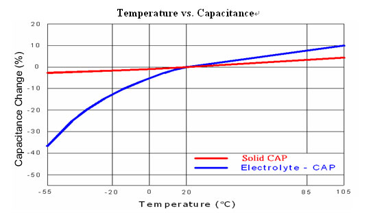 The chart above shows that solid capacitors are able to deliver substantially lower impedance at higher frequencies. Because there is less impedance at higher frequencies, solid capacitors are more stable and generate less heat than electrolytic capacitors. Solid capacitors also deliver more stable capacitance and are less likely to be affected by temperature changes. As the chart below shows, even at extreme temperatures, solid capacitors have relatively stable capacitance, especially when compared to electrolytic capacitors. |