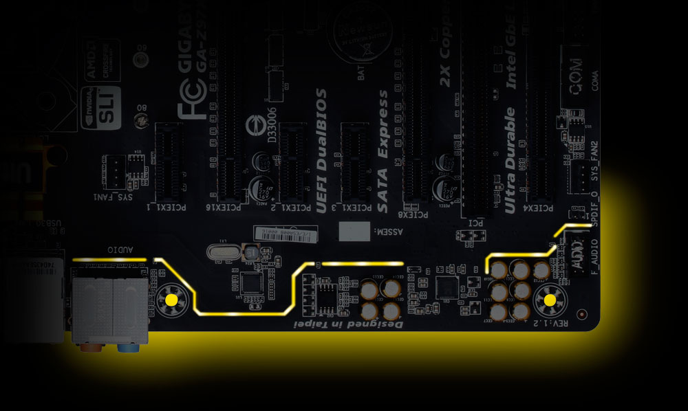 - شريحة صوت Realtek ALC1150 لصوت فائق الوضوح بمعدل نقاء 115dB SNR مع مكبر صوت خلفى مدمج