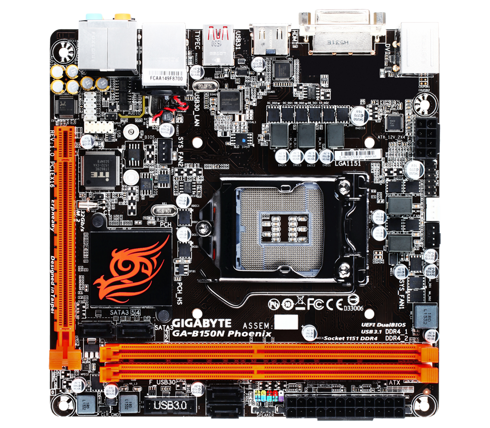 The GIGABYTE GA-B150N Phoenix is equipped with exclusive Pulse LED lighting on the underside of the PCB, providing a signature look for any custom PC build. The soft-glowing orange lighting elegantly phases in and out during system operation, bringing the life to GIGABYTE B150N Phoenix.