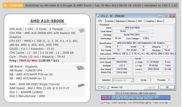Das Übertakterteam „The Killers“ von GIGABYTE (mit HiCookie, S. Dougal und John Lam) nahm auf einer Übertaktungsvorführung von AMD Extreme am 20. November in Taipei, Taiwan, an einer Übertakterdemonstration teil und stellte mit den neuen Plattformen Vishera und Trinity von AMD zwei neue Rekorde auf. Das GIGABYTE F2A85X-UP4 Mainboard brachte die AMD 5800K auf unglaubliche 7,86 GHz, mehr als das Doppelte der Geschwindigkeit von 3,8 GHz mit Stock Clock. Der AMD FX8350 Prozessor erreichte mit einem GIGABYTE 990FXA-UD3 Mainboard 8,47 GHz.