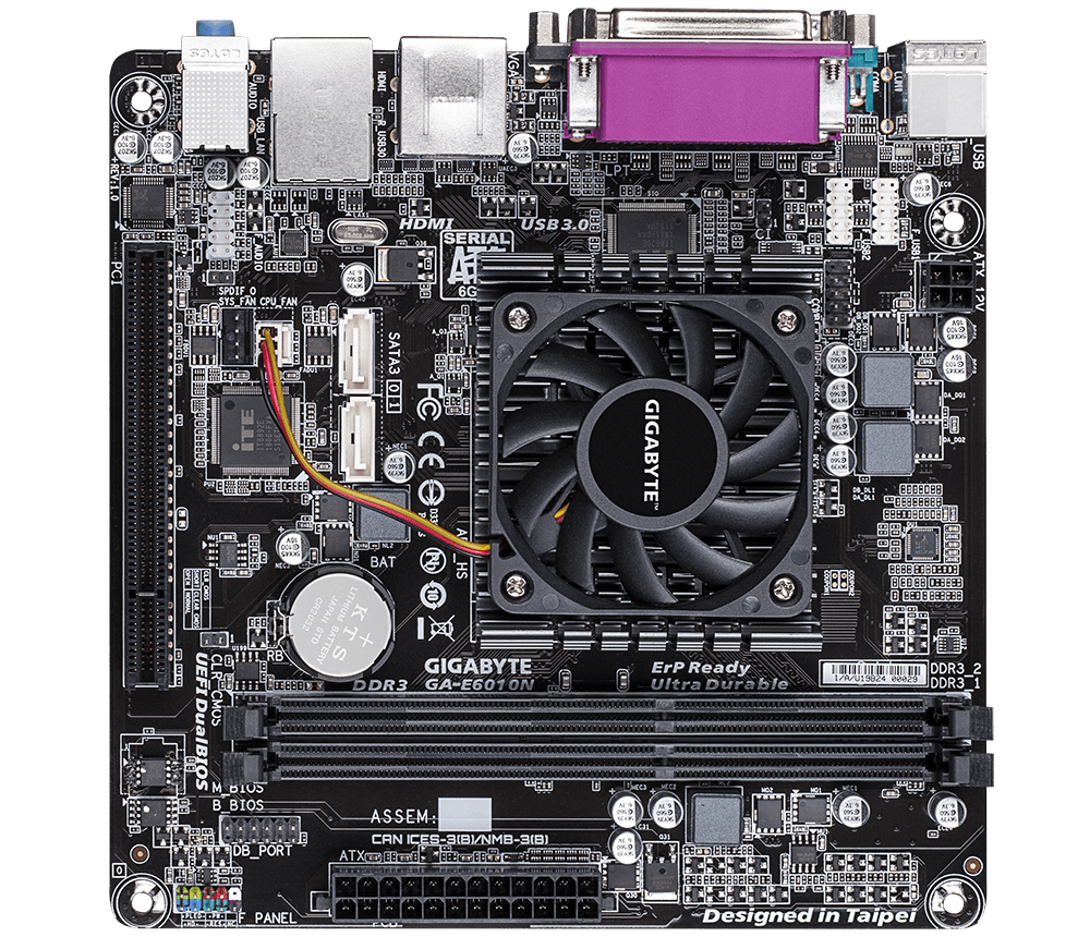 The GIGABYTE E6010N Mini-ITX motherboard is a fully integrated PC motherboard featuring the AMD Dual Core E1-6010 APU with Radeon™ R2 graphics (DX12). Designed for compact, small form factor PC systems and devices, the GIGABYTE E6010N is mission critical systems, as well as extreme efficiency digital entertainment systems. Connectivity includes digital and analog display outputs via HDMI and D-sub ports, while the HDMI port offers native support for 4K resolution displays.