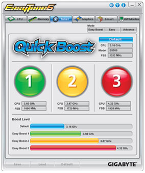 GIGABYTE Quick Boost provides 3 levels of CPU performance enhancement; a simple click on the desired level delivers quick and effortless overclocking for novice and experienced users alike.
