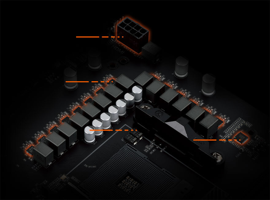 • With 12+2 Phases 50A DrMOS, each power phase connects to the CPU and provides more balanced and efficient power delivery. With capability to handle up to 700 Amps current in a total.