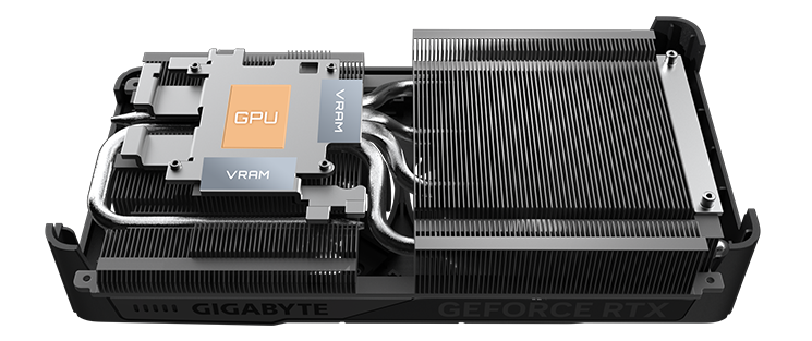 The copper plate directly contacts the GPU, coupled with the composite copper heat pipes, which quickly transfers the heat of the GPU and VRAM to the heatsink.