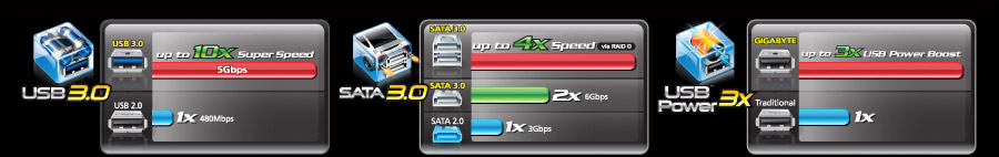 وضعت سلسلة اللوحات الرئيسية 333 Onboard Acceleration من GIGABYTE معياراً جديداً للأداء المتميز من خلال دعم أحدث تقنيات نقل البيانات التي تتميز بالسرعات العالية. ولتثبت مرة أخرى الريادة الحقيقية للابتكار في عالم اللوحات الرئيسية، فإن سلسلة اللوحات الرئيسية 333 Onboard Acceleration تمنح أداءاً لا يقارن بدعمها لأحدث التقنيات مثل SuperSpeed USB 3.0 من شركة NEC، وSATA 3.0 بسرعة 6GBPS من شركة Marvell، بالإضافة إلى مضاعفة الطاقة الكهربية التي تصل إلى منافذ USB بمقدار 3 أضعاف (3x)، وهو ما لم يحدث من قبل في عالم اللوحات الرئيسية، لتلبية احتياجات مختلف الأجهزة التي تدعم USB.