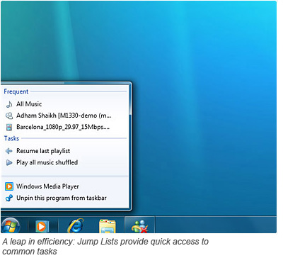 With Windows 7, we focused on keeping the things you use most right in front of you. One example: The new Jump List feature. It's a handy way to quickly reach the files you've been working with. To see the files you've used recently, just right click on the icon on your taskbar. So right-clicking on the Word icon will show your most recent Word documents. Plus, if there are other files you want to keep handy, you can just pin them to the Jump List so they’ll always appear. That way, the documents you’re likely to want are just a couple clicks away.