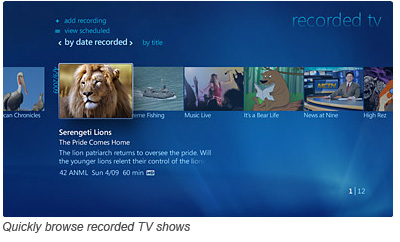 With a streamlined user interface and support for new content types and digital TV, Windows Media Center in certain editions of Windows 7 makes watching TV, movies, and other video content on your PC easier than ever. With a simple USB TV Tuner you can record and watch shows on your schedule. Windows Media Center has been updated to manage a single TV guide containing both standard and digital high definition TV shows.