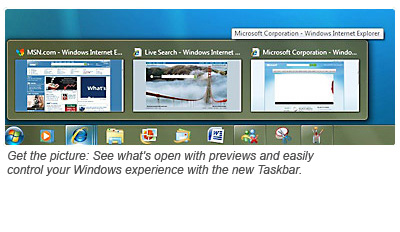 The taskbar at the bottom of your screen is what you use to launch programs and switch between them when they're open. In Windows 7 you can pin any program to the taskbar so it’s always just a click away, and you can rearrange the icons on the taskbar just by clicking and dragging. We’ve made the icons considerably bigger, too, so they’re easier to use. Hover over the icons and you’ll see thumbnails of every file or window that open in that program, and if you hover over the thumbnail, you’ll see a full-screen preview of that window. Move the cursor off the thumbnail and the full-screen preview disappears.