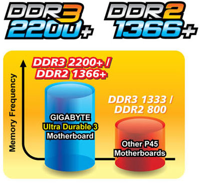 Liefert native Unterstützung für DDR3 2200+ und DDR2 Speicher bis zu 1366+ MHz. GIGABYTE´s Ultra Durable 3 Mainboardsserie ermöglicht dem Nutzer höhere Speicherfrequenzen bei niedriger Spannung zu erreichen und höhere Speicherperformance mit niedrigem Stromverbrauch zu erzielen, um selbst speicherintensive Anwendungen wie High-Definition Videos und 3D Spiele mit einer Leichtigkeit zu nutzen.
