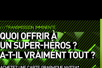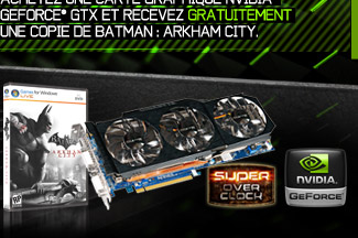 Offre à durée limitée. Recevez pour l’achat de toute carte éligible NVIDIA® GeForce® GTX 560,560 Ti, 570, 580 ou 590 – un coupon pour télécharger gratuitement la version PC de Batman: Arkham City. Offre exclusivement valable chez les revendeurs agréés. Voir termes et conditions applicables. Pour plus de d'informations, rendez-vous surwww.GeForce.com/FreeBatman