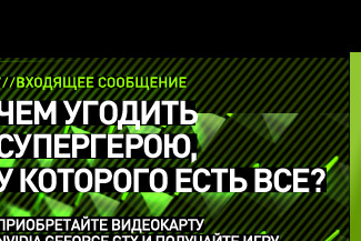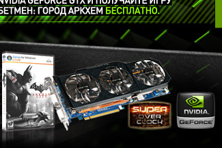 В течение срока действия предложения покупайте участвующую в акцию видеокарту NVIDIA GeForce GTX 560,560 Ti, 570, 580 или 590 и получите купон на бесплатную закачку игры Batman:Arkham City для ПК. Предложение доступно только у отдельных торговых представителей в соответствии с указанными сроками и условиями. За более подробной информацией зайдите на страницуwww.GeForce.com/FreeBatman |