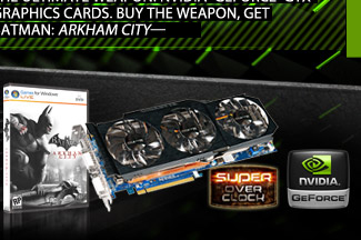 It takes the ultimate crusader to get Arkham City’s characters in line—and the ultimate ammo. Gear up with NVIDIA® GeForce® GTX graphics cards and take on Batman: Arkham City in all its gritty glory with NVIDIA PhysX® and DirectX 11 technologies that add impact and realism to every scene. Buy the card today, and get the PC game FREE. |