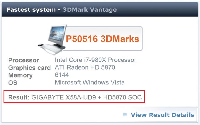 GIGABYTE GA-X58A-UD9 mengambil mahkota 3DMark Vantage Tercepat System dengan P50516 (3/31/2010)