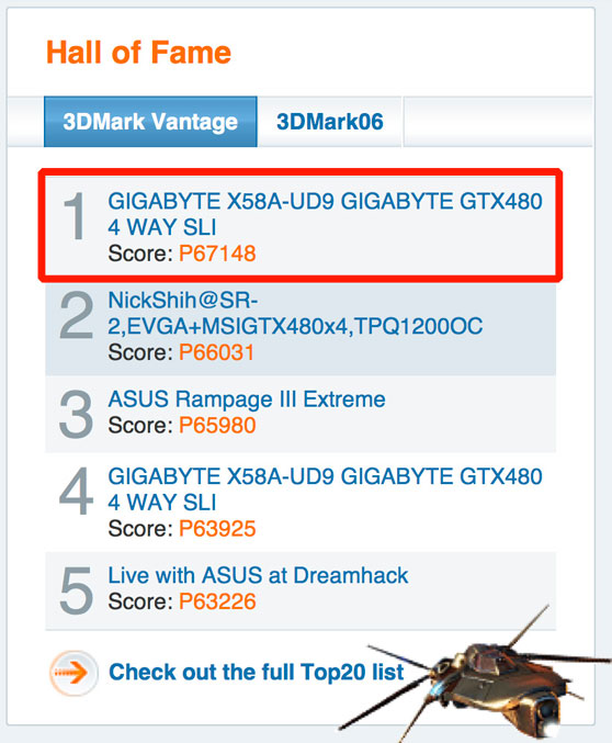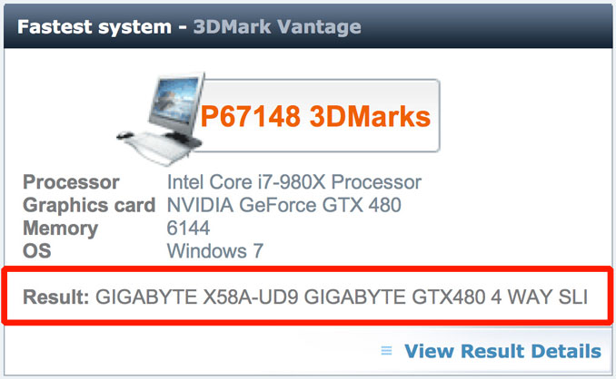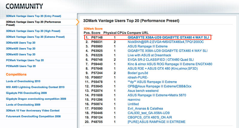 GIGABYTE GA-X58A-UD9 mengambil mahkota 3DMark Vantage Tercepat System dengan P67148 Marks (7/27/2010)
