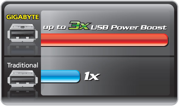 GIGABYTE On/Off Charge technology allows you to charge your iPhone, iPad and iPod Touch regardless of whether your PC is on, in standby mode or even off. A derivative of GIGABYTE's highly acclaimed 3x USB Power feature, On/Off Charge enables devices to draw more current from GIGABYTE motherboard USB ports than standard USB ports allow, so that charging from your PC can be as fast as with a charger. |