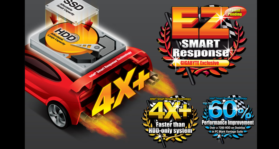 GIGABYTE Z68 series motherboards are equipped with the much anticipated Intel® Smart Response Technology, allowing users to experience system performance similar to SSD only systems. Intel® Smart Response technology works by using intelligent block-based caching of frequently used applications to improve system performance and responsiveness. In fact, GIGABYTE Z68 motherboards with Intel® Smart Response Technology are able to outperform hybrid drive systems by more than 2X (PC Mark Vantage HDD test) and HDD-only systems by as much as 4X (PC Mark Vantage HDD test) and deliver a 60% performance improvement over HDD-only systems in PC Mark Vantage Suite.