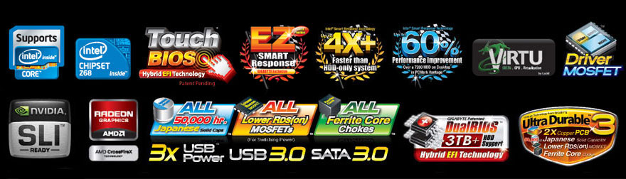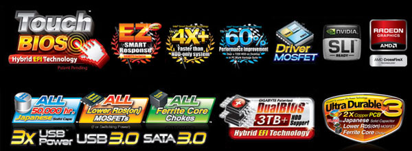 On/Off Charge, UD3, Smart6, SLI+CrossFireX, DualBIOS 3TB+ HDD Support, Turbo USB3, Turbo XHD,
