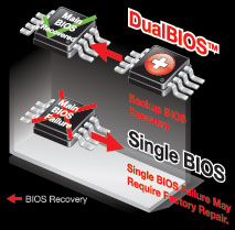 DualBIOS™ is a GIGABYTE patented technology that automatically recovers BIOS data when main BIOS has crashed or failed. Featuring 2 physical BIOS ROMs integrated onboard, GIGABYTE DualBIOS™ allows quick and seamless recovery from BIOS damage or failure due to viruses or improper BIOS updating. |