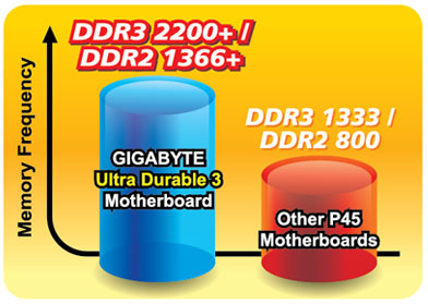 Delivering native support for DDR3 up to 2200+ and DDR2 up to 1366+ MHz, GIGABYTE Ultra Durable 3 series motherboards allow users to reach higher memory frequency at lower voltage; achieving higher memory performance with lower power consumption to run even the most memory intensive applications such as high-definition video and 3D games with ease.
