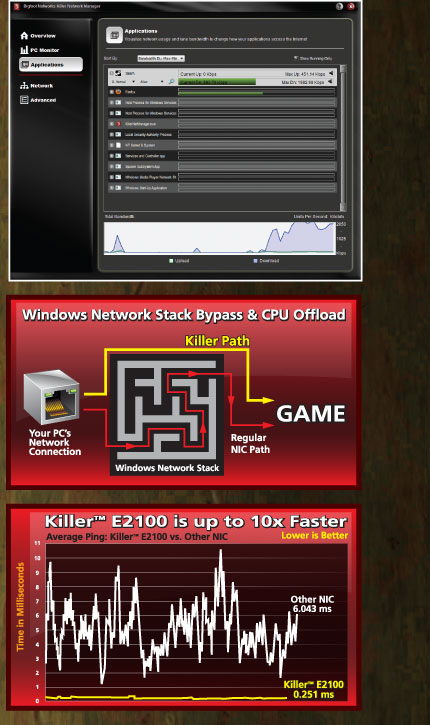 Bigfoot Networks Killer™ E2100 게임네트워크 플랫폼 내장 기가바이트는 온라인 게임 네트워크가 느려지는 문제를 진지하게 고민하고 해결을 위해 노력해온 유일한 메인보드 제조업체로서, Bigfoot Networks Killer™ E2100 게임네트워크플랫폼을 직접 새로운 G1-Killer게임용 메인보드에 통합했다. Bigfoot Networks사의 Killer™ E2100 게임네트워크 플랫폼과 함께 네트워크 전용 프로세서(Network Processing Unit,NPU)와 독창적인 게임 네트워크 DNA™ 기술을 통해 온라인 게임을 신나게 즐길 수 있게 해준다.
