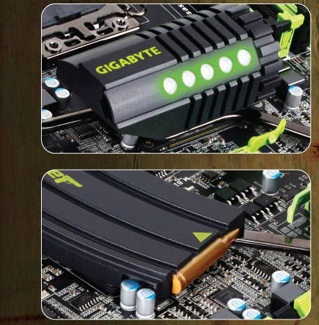 쿨링칩의 열전도관 총신형 디자인 기가바이트 G1-Killer 게임용 메인보드는 새로운 열전도관 쿨링장치 설계를 적용하여 시각적으로 날카로운 느낌을 주는 한편 쿨링 효과를 훨씬 강화했다. 메인보드의 CPU VRM 등 핵심부에서 유기적으로 열을 발산시키므로, 기가바이트 G1-Killer게임용 메인보드는 전투가 치열할 때에도 저온 냉각 상태를 유지할 수 있다. 군인이 전선으로 파견될 때 분배되는 총기 장치를 모방하여, 권총, 보총, 탄창 디자인을 도입하여, 총신형 열전도관 쿨링장치 디자인은 보총의 배럴 플루팅과 비슷한 독창적인 플루팅 기술을 적용하여 최대 발열량을 처리할 수 있다. |