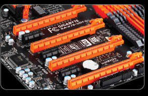 X79-UD7은 4-way CrossFireX™ 및 4-way SLI™을 지원한다(OC-PEG를 사용해야 4-way 그래픽을 지원)