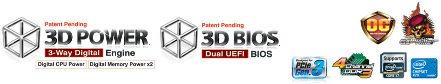 12페이즈 전원, 울트라 듀러블 메인보드3, 3 Way SLI, 3 Way CrossFireX, 3D Power, 3D BIOS, UEFI DualBIOS™, On/Off Charge, Cloud OC, 일본산 솔리드 커패시터, Dolby Home Theater, 110dB |