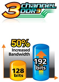 Support for 3 channel DDR3 memory with 50% bandwidth increase to 192 bits