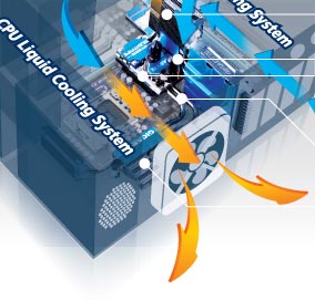 Liquid Cooling system featuring special waterblock design with an enlarged dissipating surface area for enhanced heat dissipation and optimum flow-rate.