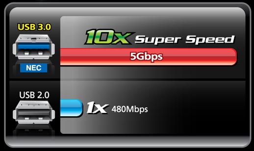 Al usar la nueva generación de Interfaz SuperSpeed USB 3.0 de NEC, con una transferencia 10x mayor a la del USB 2.0, la interfaz USB 3.0 es capaz de realizar transferencias dual-simplex al mismo tiempo de la PC al USB para mejorar la eficiencia en la transferencia de los datos |