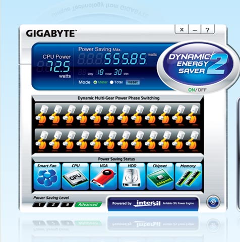 Dynamic Energy Saver™ 2 de GIGABYTE incorpora un grupo de inteligentes características que usan diseños de hardware y software propietario para incrementar considerablemente la eficiencia energética de la PC, reducir el consumo y ofrecer cambios automáticos en las fases para el CPU, Memoria, Chipset, VGA, Discos Duros y ventiladores. Con el simple click de un Botón Dynamic Energy Saver™ 2 de GIGABYTE provee excepcionales ahorros de energía y el uso de energía más apropiado sin sacrificar el rendimiento.