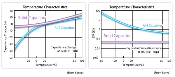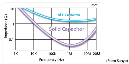 Menor Equivalent Series Resistance (ESR) quiere decir que los capacitores sólidos reducen la impedancia a altas frecuencias. Debido a la baja impedancia los capacitores sólidos son más estables y generan menos calor que los electrolíticos.