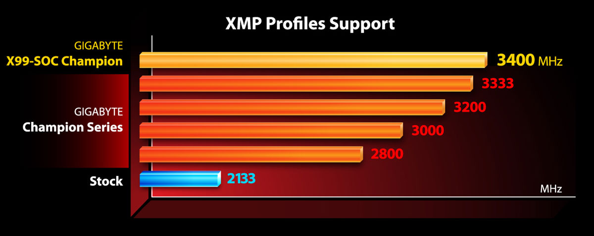Paired with DDR4 memory such as the Corsair® Limited Edition Orange Dominator® Platinum kit, which was custom designed for the GIGABYTE X99-SOC Champion motherboard, users can take advantage of better responsiveness during gaming and faster operation execution in memory demanding works applications. |