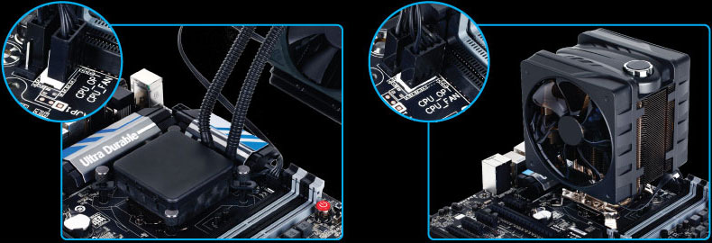 Many of today’s 3rd party water cooling systems require CPU fan power support for both the cooling fan and the water pump. GIGABYTE 8 Series motherboards feature OPT fan support, an additional CPU fan pin header that can be used to connect a water pump and configured for continuous full speed operation. The OPT Fan is also useful for high performance coolers employing two fans. |