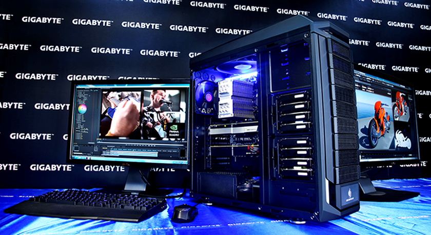 Bilden ovan föreställer en Workstation byggd kring GIGABYTE X79S-UP5-WIFI. Några av ingredienserna består av: Intel Xeon E5-2687W, NVIDIA Quadro 5000 plus Tesla C2075, 32GB (4 x 8GB) Kingston ECC DDR3, 8x Seagate SAS 500GB HDD (RAID-0), Kingston HyperX 3K 90GB SSD (OS), Cooler Master TPC Cooler, CM Storm Trooper Chassis tillsammans med ett GIGABYTE Sumo Platinum 1200W.