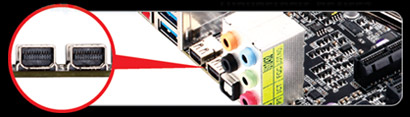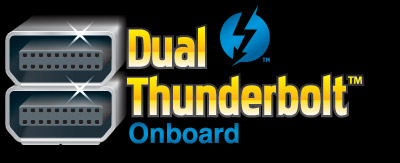เมนบอร์ด Thunderbolt™ ได้รับการรองรับ certified จาก Intel โดยคุณสมบัติ dual Thunderbolt™ ports จะถูกติดตั้งในบริเวณ back panel I/O, ซึ่งด้วยประสิทธิภาพของ Thunderbolt™ port จะช่วยทำให้การโอนถ่ายข้อมูลพร้อมกันสองทิศทางมีความเร็วสูงถึง 10Gbps – นั่นหมายความว่าคุณสามารถถ่ายโอนข้อมูลภาพยนตร์ความละเอียดสูงแบบ full HD 1080p ได้ในระยะเวลาเพียง 30 วินาที เท่านั้น