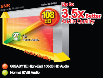 技嘉在2011年推出的所有主機板,都至少搭載瑞昱ALC889音效編解碼器,或搭配更高的音效解決方案,以提供高性能、多聲道 HD音效輸出。瑞昱的ALC889採用專有的轉換技術,它能夠實現108db訊噪比(SNR)的音效播放品質。所謂訊噪比是只音效中可用訊號與雜訊的比例(以db為單位)。較高的訊噪比等於一個更好的音頻體驗。而108db便意味著可用音效訊號比雜訊高108db,所以可提供更好的音質輸出。