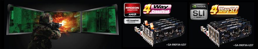 技嘉最新的900系列主機板締造高性能運算的全新里程碑,除了支援即將推出的8核心AMD FX™ 處理器,更突破多顯示卡輸出規格的極限,讓它成為全球首款同時支援4-way AMD™ Crossfire™ X 及NVIDIA® SLI™技術的AMD平台產品。 以全新的AMD990FX、990X,及970等晶片組為基礎,技嘉的900系列主機板不但提供超高的穩定性及更強大的電力供應,讓使用者可以完整榨出AMD FX系列處理器的每一分效能。