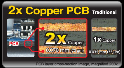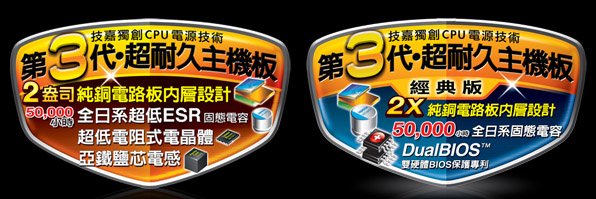 技嘉「第三代超耐久系列主機板」除2倍銅電路板設計外,亦延續第二代超耐久特色:全日系50,000小時超耐久固態電容、比一般鐵質核心電感更高電源效益的高品質亞鐵鹽芯電感及低電阻式電晶體等高階被動元件,能有效降低電源耗損及運作溫度。