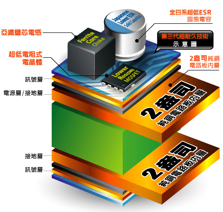 Layer)與接地層(Ground Layer)採用2盎司純銅設計,協助主機板更迅速地降低運作溫度,增加電源效率而且能夠讓超頻後的系統更加穩定。