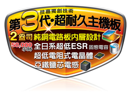 技嘉科技延續「第二代超耐久技術」品質至上的產品設計理念,2008年再度以創新科技領先業界,推出「第三代超耐久主機板」,證明技嘉科技對主機板設計的嚴苛要求及對品質的絕對保證。第三代超耐久技術首創桌上型主機板採用2盎司純銅電路板設計,此創新的設計概念就是在印刷電路板(PCB)的電源層(Power
