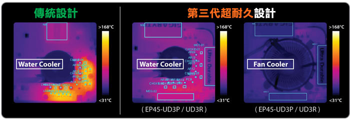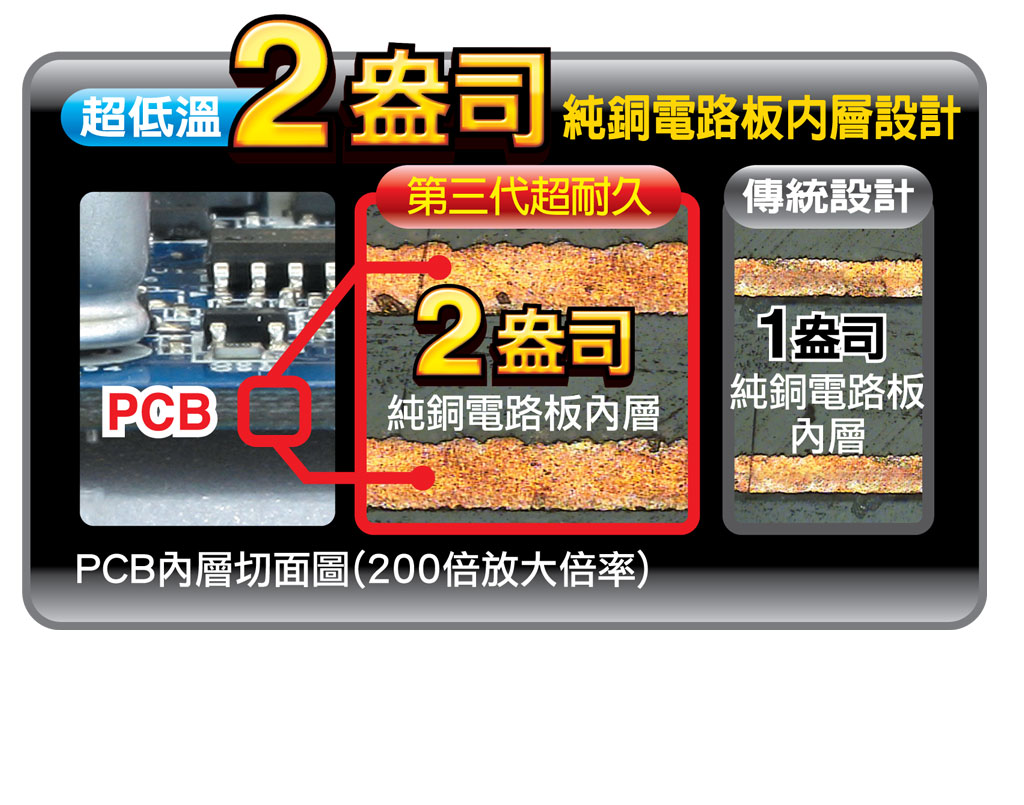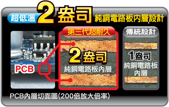 2盎司純銅電路板設計能提供更有效益的散熱解決方案,更高效率地傳導分散主機板區域的熱源,如處理器區域熱源平均分散至整張主機板,實驗數據顯示,「技嘉第三代超耐久技術主機板」,相較於傳統主機板的運作溫度,可降低溫度達50°C。 |