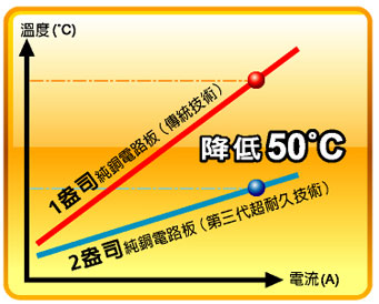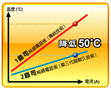 降低系統運作溫度達50°C 及降低2倍阻抗 |