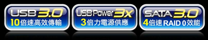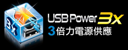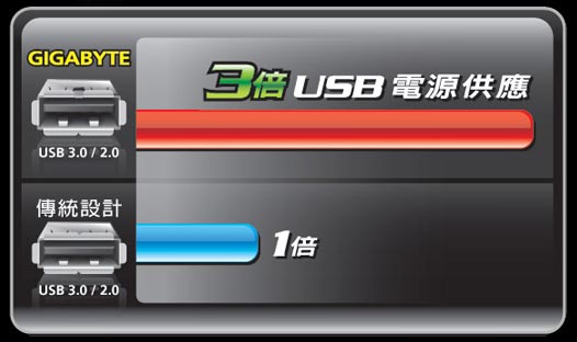 | 技嘉獨特的USB 3 倍力設計可以帶來更多相容性及穩定性,如常常使用的外接式硬碟及光碟機,只需透過技嘉3倍力設計,單埠USB即能給予充足的電力,取代以往得插入多埠才能使用的電力。 |