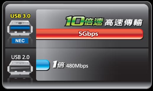 NEC新一代SuperSpeed USB 3.0控制晶片能提供比USB2.0介面快10倍速以上的資料傳輸率。USB 3.0採用雙向傳輸管理介面,能於電腦主機上的USB及連接USB裝置後同時進行接收與傳送,提供更高的傳輸效率。