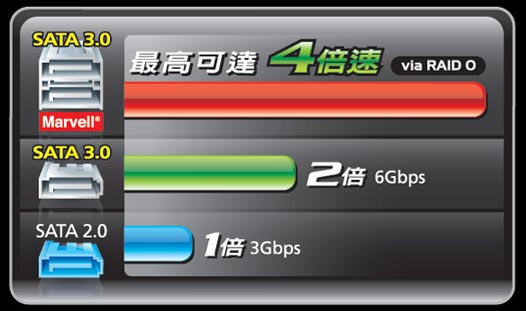 主機板內建Marvell® 最新儲存介面規格SATA Revision 3.0 ( SATA 6Gbps)晶片,能夠加倍硬碟效能。另透過磁碟陣列RAID 0(Stripe)模式,SATA Revision 3.0 介面可以提供比SATA Revision 2.0 高達4倍以上的速度。