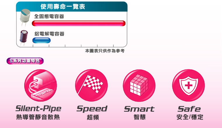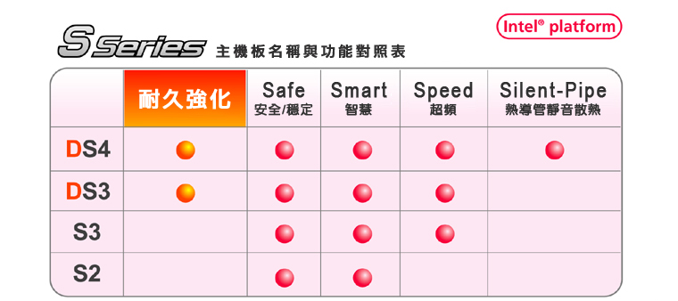 尋找高效能主機板 ? 不可錯過 " 技嘉 S 系列主機板 " ! 技嘉研發團隊秉持著滿足消費者多元化的需求為研發產品的最終精神,推出最新 "S 系列主機板",不但 支援Intel® CoreTM 2 Duo處理器,更強調技嘉最新獨創技術:Safe( 安全 / 穩定 )、Smart( 智慧 )、Speed( 超頻 ) 及 Silent-Pipe( 熱導管靜音散熱 ) ,這些獨創的新技術,不僅僅是提升一般辦公人員的工作效率,更是大大滿足了狂熱超級玩家需求。 技嘉 S 系列主機板,均搭載 Safe( 安全 / 穩定 )、Smart( 智慧 ) 功能,擁有 優越的硬體設計、防護技術,系統快速回復工具,與人性化的操作介面,在進行電腦硬體監控或 BIOS 的更新上,更簡易快速!此外,技嘉具備 Speed( 超頻 ) 功能的 S 系列主機板,搭載強大的系統超頻調校能力,有技嘉獨創大受好評的 Easy TuneTM 5 與 M.I.T. 的智慧型超頻超壓調整工具,藉由 R.G.B. 繪圖卡 BIOS 加速設定工具搭配,讓玩家享受獨特的超頻樂趣;而 具備 Silent-Pipe( 熱導管靜音散熱 ) 功能的 S 系列主機板, 更搭載符合未來潮流的熱導管靜音式散熱技術,同時提供 靜音、低耗能的絕佳散熱系統 。對於追求高效能、高穩定、高品質、與優異超頻的主機板使用者而言,怎能錯過 "技嘉 S 系列主機板" ! 此外,為了確保系統隨時保持在高度穩定性中,並有效延長電腦平台的使用壽命,技嘉科技耐久強化 (Durability Enhanced) 主機板, 領先業界的採用效能優異的高傳導鋁質固態電容 (Conductive Polymer Aluminum Solid Capacitor) , 藉由此高品質零件的高導電性與極佳的抗熱性,享受更耐久穩定的系統 。技嘉科技耐久強化 (Durability Enhanced) 主機板絕對是 讓玩家與使用者的 第一選擇! 我的主機板擁有哪些功能特色? |