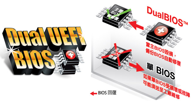 令人振奮的 3D BIOS™ 技術內建兩組實體的BIOS晶片,其中包含技嘉獨家設計的 UEFI DualBIOS™技術。卓越的32位元彩色圖形介面及流暢便利的滑鼠操作功能設計,UEFI DualBIOS™對BIOS架構初學者及進階使用者來說,都是同樣令人期待的。技嘉UEFI DualBIOS™也原生支援大容量硬碟搭配64位元作業系統使用。