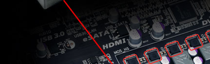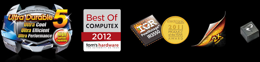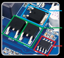 技嘉第五代超耐久™ 主機板,使用 IR3550 PowIRstage® 晶片,內建業界最高60安培的超高耐電流能力,並具有更低電源損耗、絕佳電源效率和出色的散熱管理。