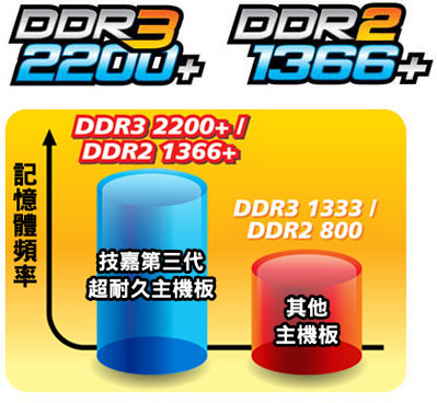 「技嘉第三代超耐久主機板」系列支援原生DDR3記憶體至 2200+ MHz、DDR2記憶體至 1366+ MHz,即使執行較嚴苛的程式系統如高畫質影片或3D遊戲…等等,可以讓使用者輕易地在低電壓時超頻至高時脈,較低功耗而高時脈高效能的記憶體也都能很穩定的運作,透過軟硬體的協調設計,讓記憶體模組效能發揮到極致。